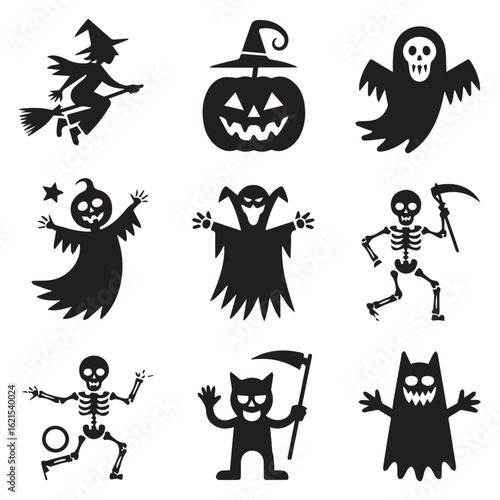 Collection of halloween silhouette icons featuring witch on broom, pumpkin, ghost, skeleton, devil, cat, and other spooky characters, perfect for holiday designs and decorations