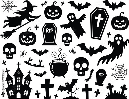 Collection of halloween silhouettes including witch bats ghosts pumpkins and haunted house