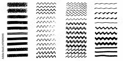 Collection of hand drawn black brush stroke lines and wavy patterns on white background