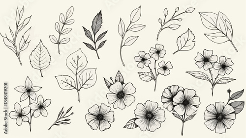 Collection of Hand Drawn Botanical Illustrations of Flowers and Leaves.