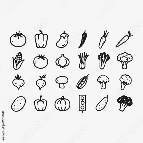 Collection of hand drawn doodle style vegetables and produce icons on a white background