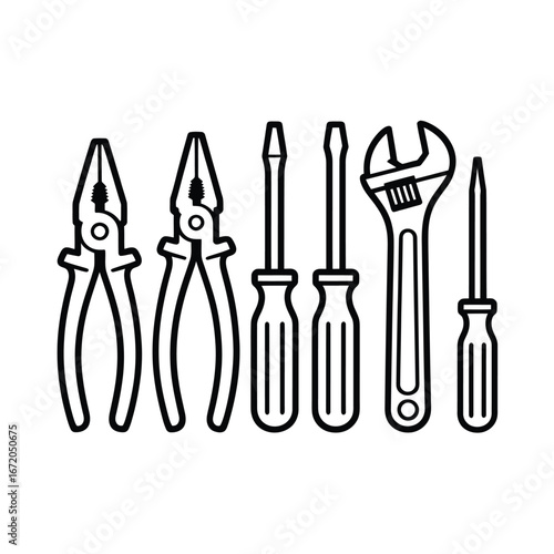 Collection of hand tools including pliers screwdrivers and adjustable wrench