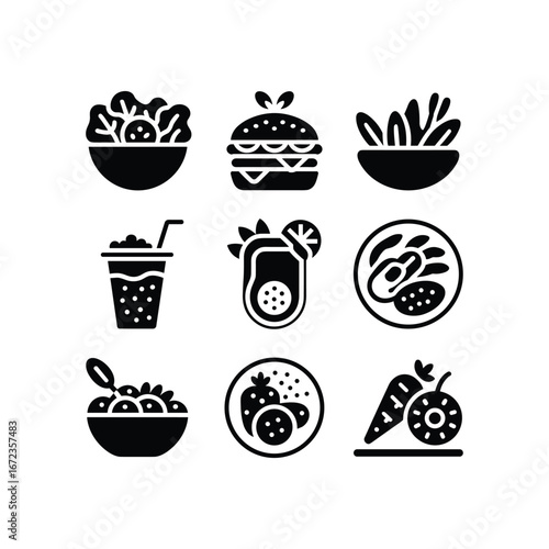 Collection of healthy food and drink icons in black silhouette style
