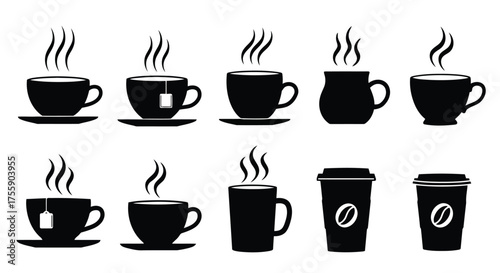 Collection of hot beverage cups and coffee cups silhouette isolated on white background