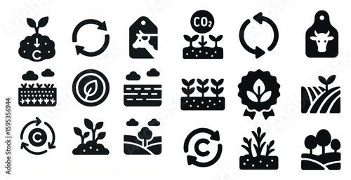 Collection of icons that represent the concept of agriculture. The icons include a cow, a plant, a tree, and a field