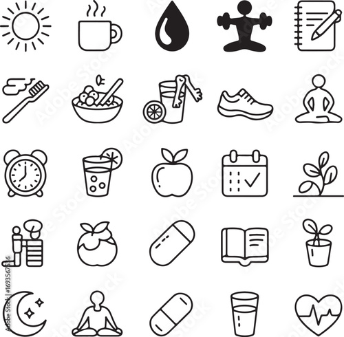 Collection of line art icons representing health wellness and daily routine hot drink water drop
