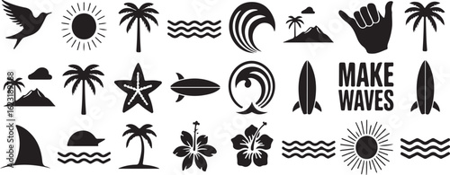 Collection of minimalistic tropical surfing and beach related illustrations in simple black and white