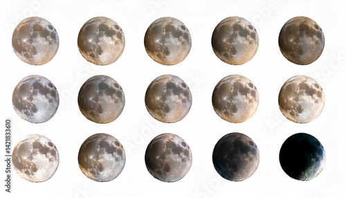 Collection of moon phases displayed in various tones and textures isolated on white backdrop.