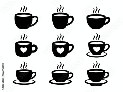 Collection of nine steaming coffee cup silhouettes isolated on white background