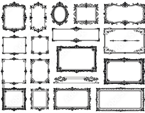 Collection of ornate black decorative frames. Various shapes and sizes, including rectangles, ovals, and horizontal banners. Intricate scrollwork and floral designs border the frames