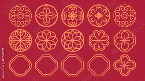 Collection of Ornate Geometric and Floral Decorative Patterns in Red and Gold Tones, Featuring Round and Octagonal Frames