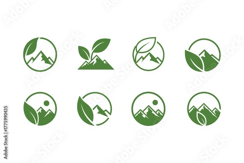 Collection of oval shaped nature inspired logos with mountains and leaves.eps