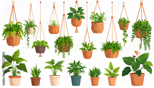 Collection of pot plants in decorative plastic containers and hanging baskets, ideal for urban indoor gardening