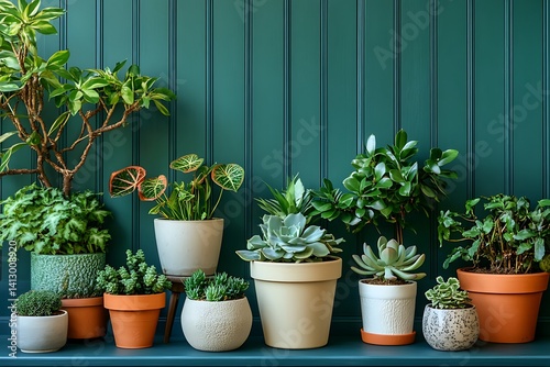 Collection of Potted Plants Against a Teal Panelled Wall Interior Decorative Plants