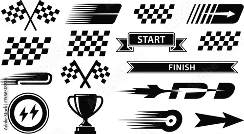 Collection of racing icons including checkered flags start finish lines and speed graphics