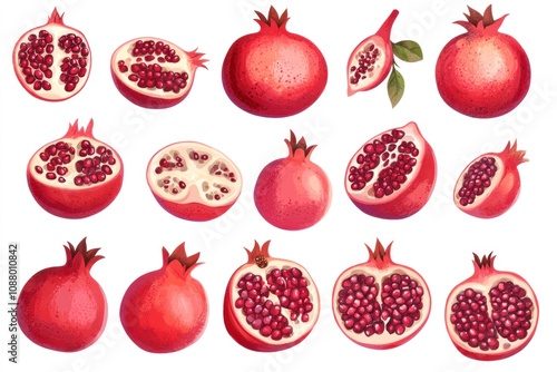 Collection of realistic hand-drawn pomegranates in different angles and cut in half with seeds.