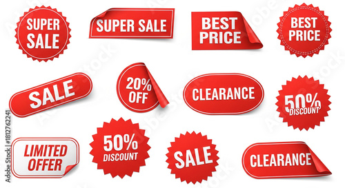 Collection of red labels with different shapes, presenting sale phrases, symbolizing promotion, offer, and bargain, good for marketing material