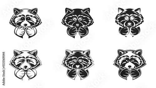 Collection of six cartoon raccoon heads with different expressions in black and white vector illustration | eps vectors silhouette