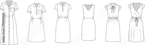 Collection of six different women’s dresses front view technical flat cad drawing vector illustration for modern fashion apparel design template mockup sketch