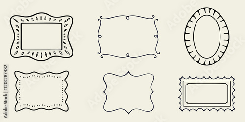 Collection of six hand drawn doodle decorative frames in black outline. Various border shapes, ornate swirls and wavy lines, perfect for invitations, labels, birthday card, scrapbooking, lunch menus.