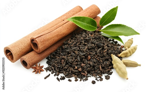 Collection of spices including black tea, cinnamon sticks, and cardamom pods arranged artistically on a white background