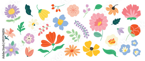 Collection of spring colorful flower elements vector. Set floral of wildflower, leaf branch, foliage on white background. Hand drawn blossom illustration for decor, easter, sticker, clipart, print.