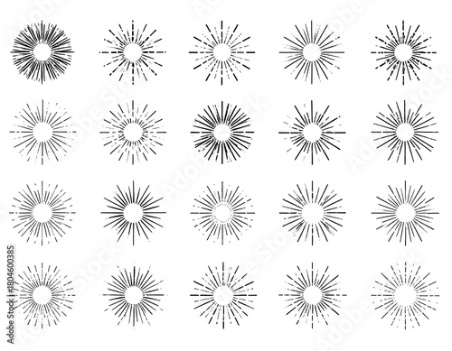 Collection of stylized radial burst designs. Each one features a central circle from which lines radiate outwards in a star-like manner