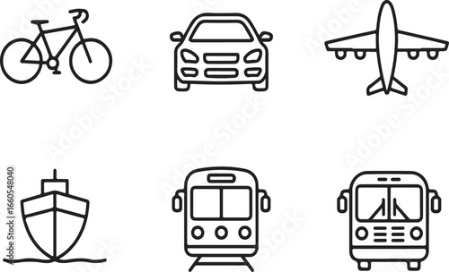 Collection of transportation icons including bicycle car airplane ship train and bus isolated on white background