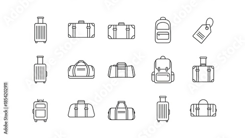 Collection of travel luggage icons and outline symbols for bags, suitcases, and backpacks.