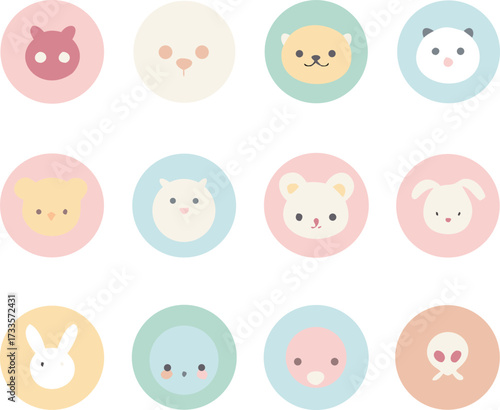 Collection of twelve adorable kawaii animal faces in soft pastel circles perfect for children s designs and cute illustrations