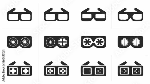 Collection of twelve stylized glasses icons with various lens designs in black and white color scheme silhouette