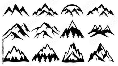 Collection of twelve stylized mountain range silhouettes in black and white vector format design graphic art