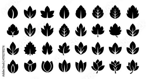 Collection of Various Black Leaf Silhouettes on White Background for Design Elements. EPS Editable
