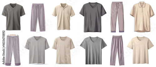 Collection of various casual clothing apparel, shirts, tshirts, polo shirts, pants, pajamas, sleepwear isolated on white background