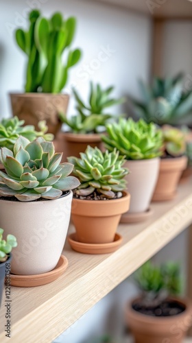 Collection of various succulent plants arranged on wooden shelves in a bright indoor space showcasing green foliage and decorative pots