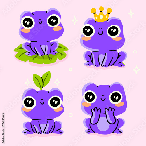 Collection of Vector Cartoon Hand draw Art. Set of Kawaii Isolated Amphibian and Purple Cute Frogs Illustrations for Prints for Clothes, Stickers, Coloring Pages.