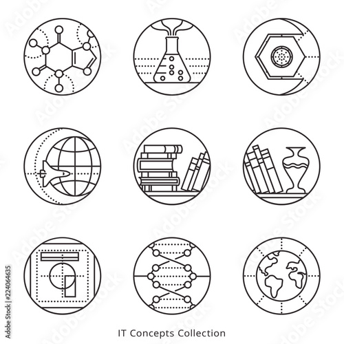 Collection of vector icons, representing different information technology concepts, such as data visualization, strategy, growth, research, branding, communication. Logo templates.