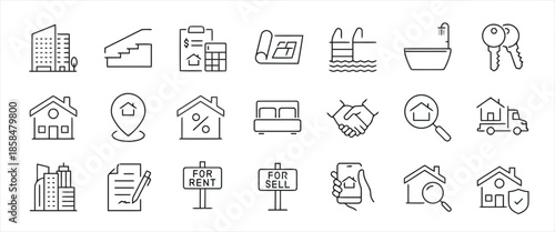 Collection of Vector Icons Representing Real Estate Business with Houses Buildings and Related Symbols Isolated on White Background Exactly Two Hundred Characters