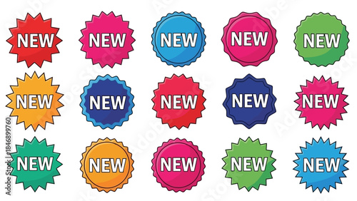 Collection of vibrant starburst badges with the word NEW for various promotional uses