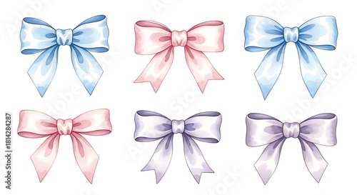 Collection of watercolor bows in pastel blue, pink, and purple shades.