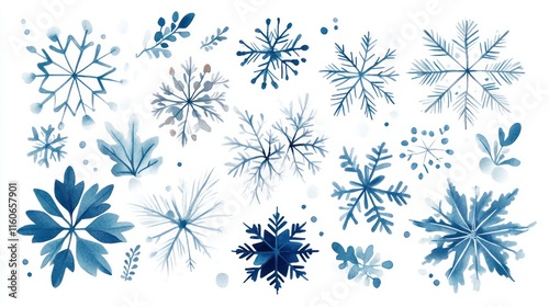 Collection of watercolor snowflakes and winter elements.
