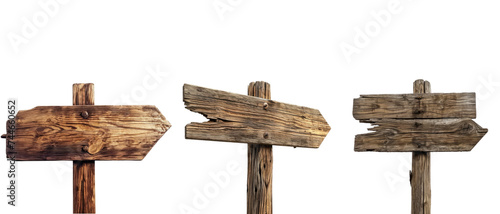 Collection of wooden direction signs with poles, isolated on white or transparent background