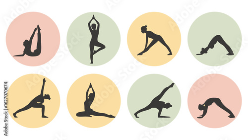 Collection of Yoga Silhouettes in Circular Patterns Representing Different