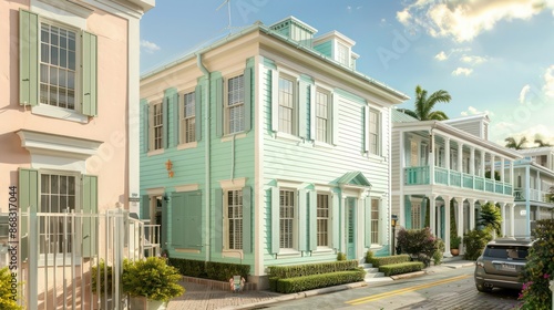 colonial townhouse with pastel green Bahama shutters, adding a touch of historic charm to the modern city