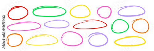 Color pencil circle scribble frame set. Handwritten color brush marker, crayon pencil scribble stroke line doodle childish oval frame. Grunge brush ellipse frame round highlight. Vector illustration