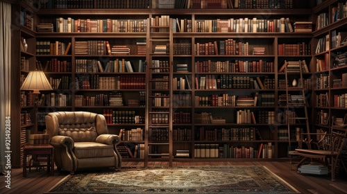 Color photo of a stylish home library, dark wood bookshelves with a ladder, comfortable armchair, warm ambient lighting