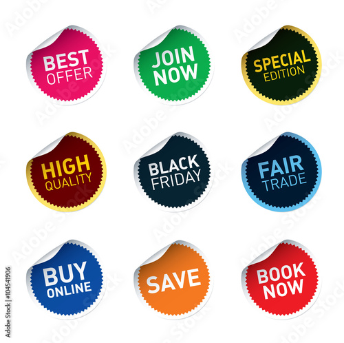 Color vector stickers SAVE, FAIR TRADE, JOIN NOW, BEST OFFER