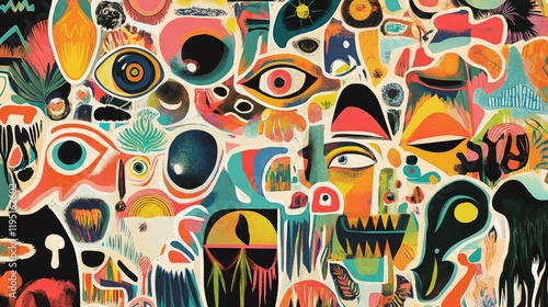 Colorful Abstract Art Collage with Eyes and Faces Design Elements