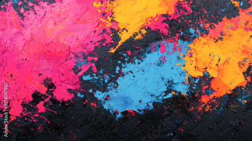 Colorful abstract art with vibrant splashes of pink, orange, blue, and black background.