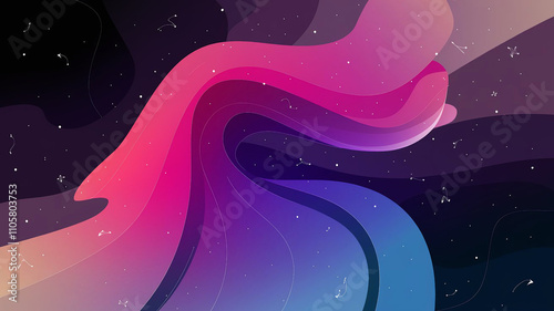 Colorful abstract design featuring flowing shapes in pink, purple, and blue against a dark background with subtle star details.